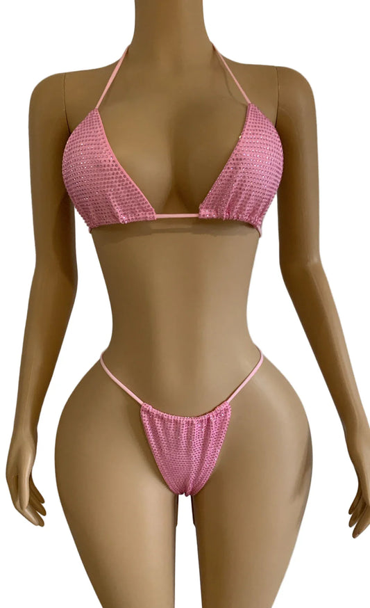 Heartbreaker Two-Piece Fishnet Rhinestone Bikini Set - Pink