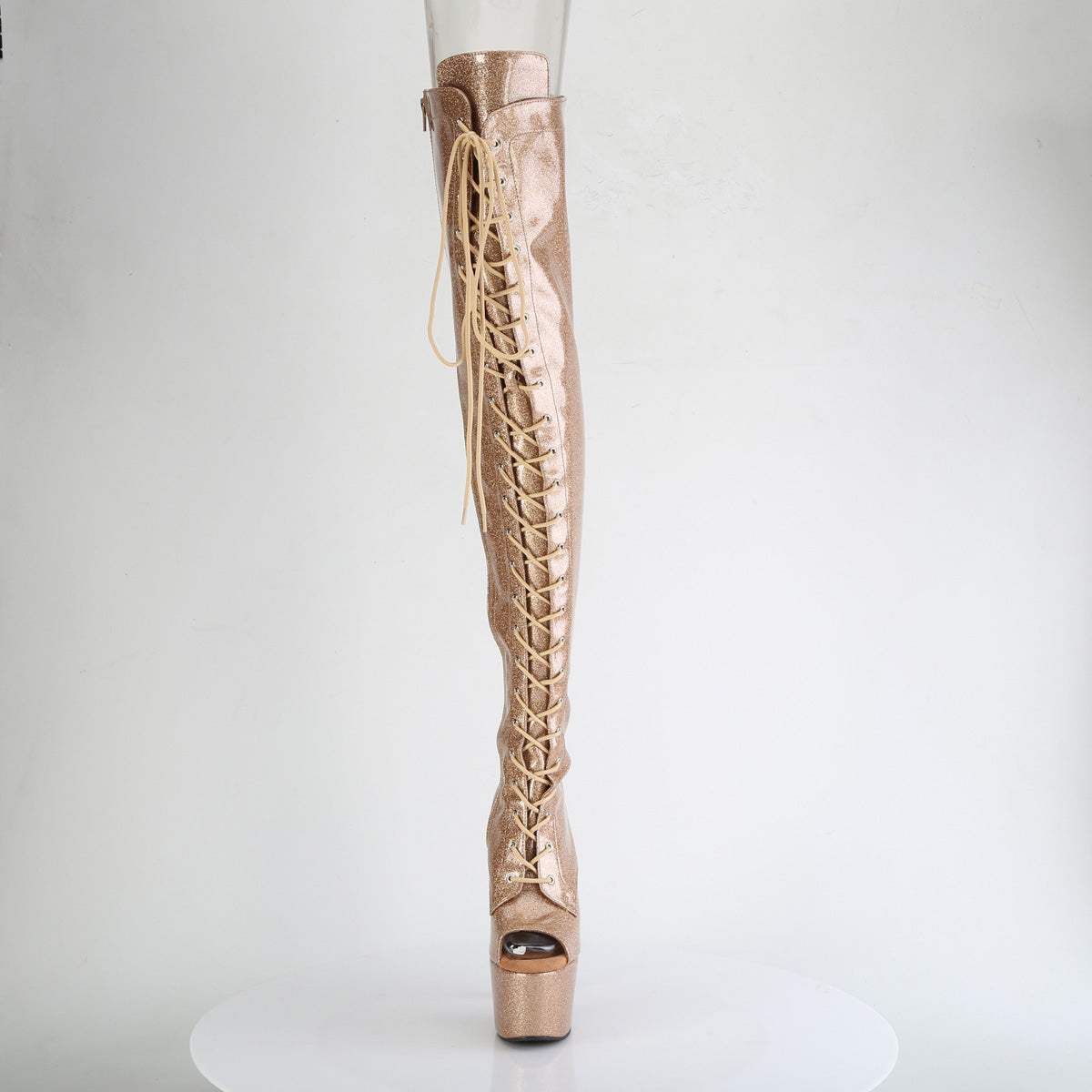 Full Description: 7" Heel, 2 3/4" PF Peep Toe Lace-Up Thigh Boot, Side Zip