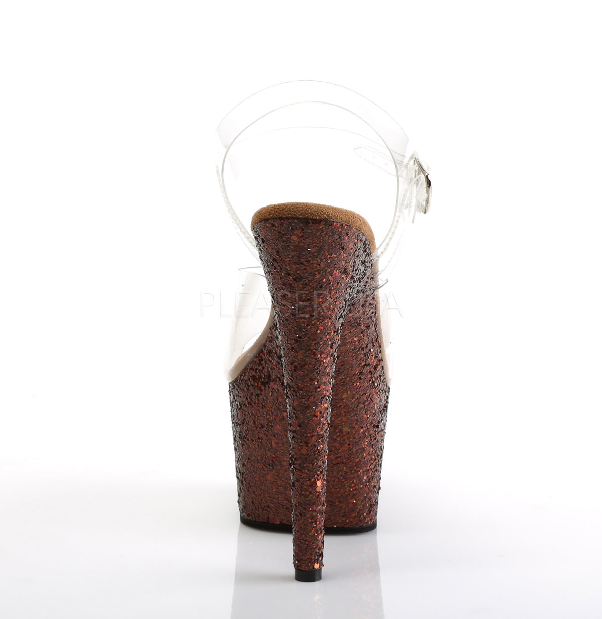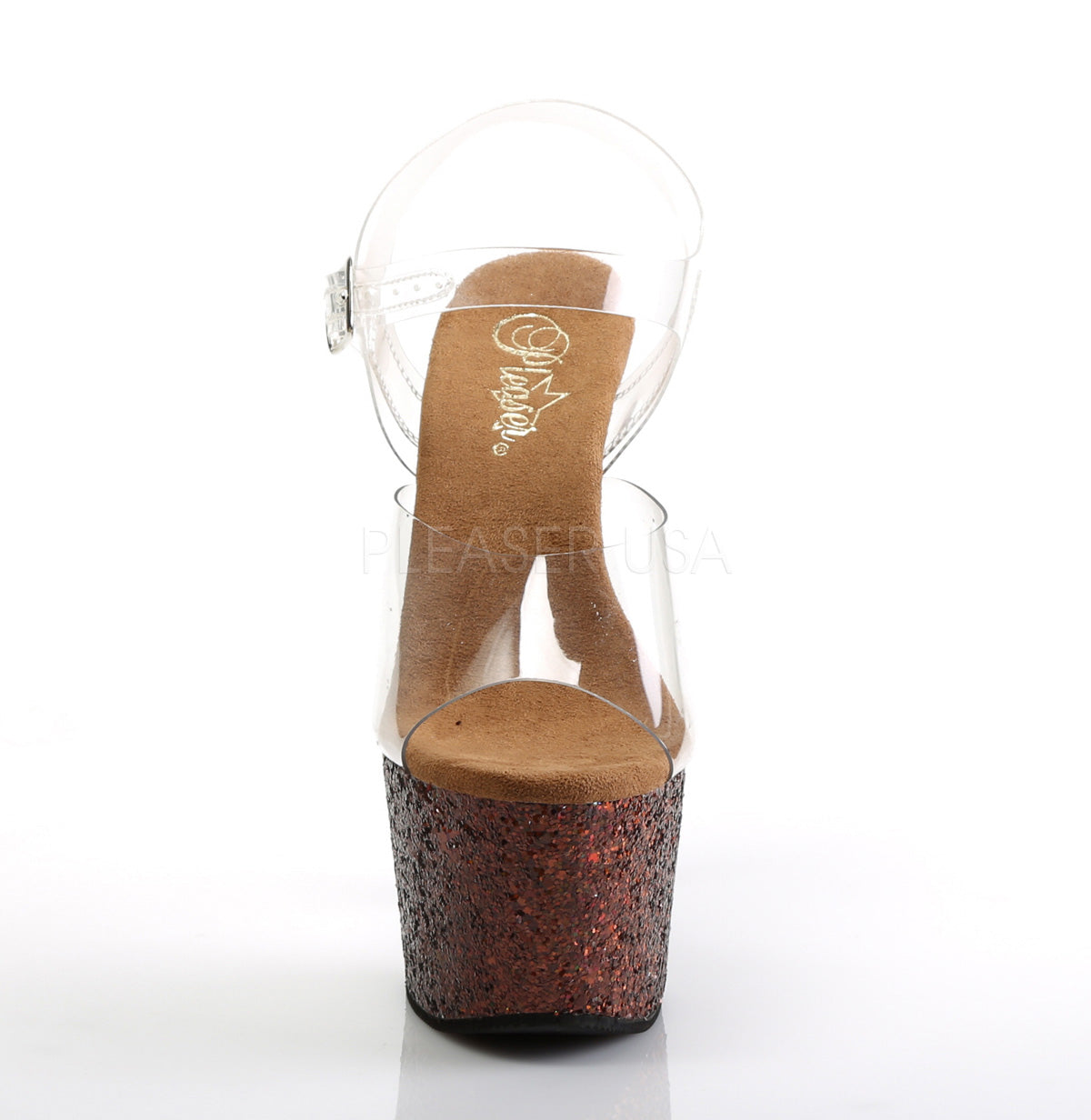 Full Description: *7" Heel, 2 3/4" PF Ankle Strap Sandal W/ Glitter Bottom