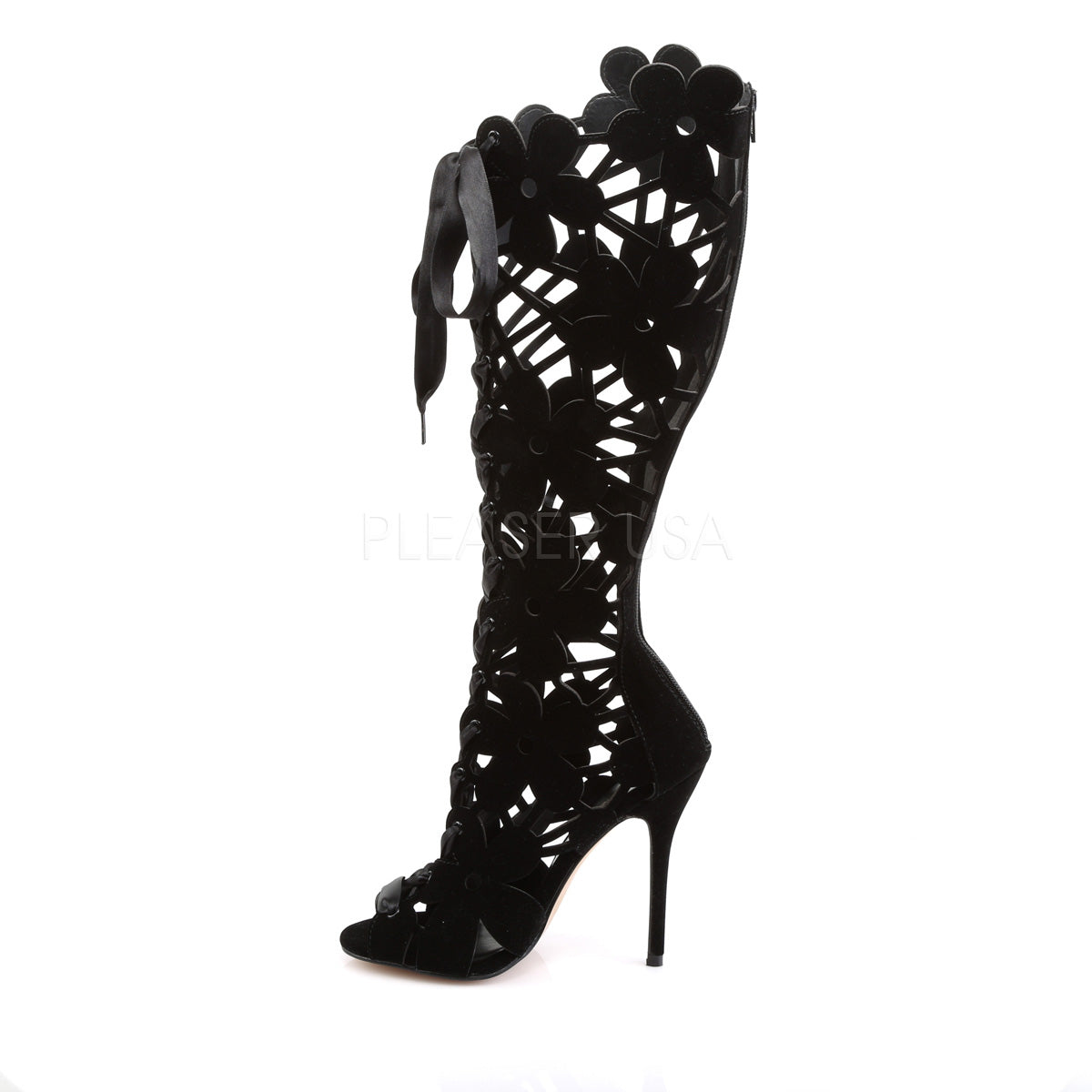 Full Description: 5" Heel, Open Toe Front Lace-up Knee High Boot