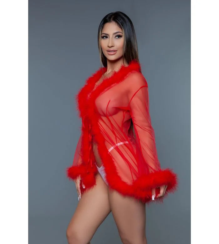 - Description: One of our top sellers. Shorter version of our famous marabou feather trim sheer robe with ribbon ties. Look like a movie start or just act like one when wearing this super sexy ensemble. This style comes with a matching color G-String.