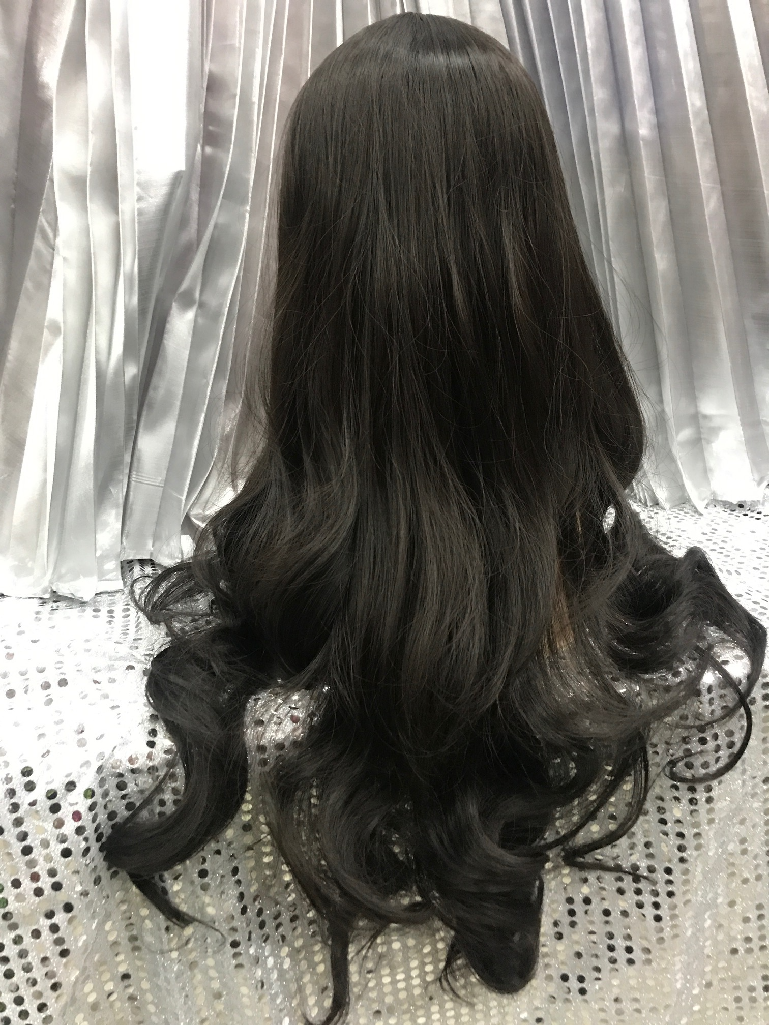 Luxurious long 26" synthetic heat resistant wig. Wavy texture with natural looking center part and fringe can be parted in center or side.