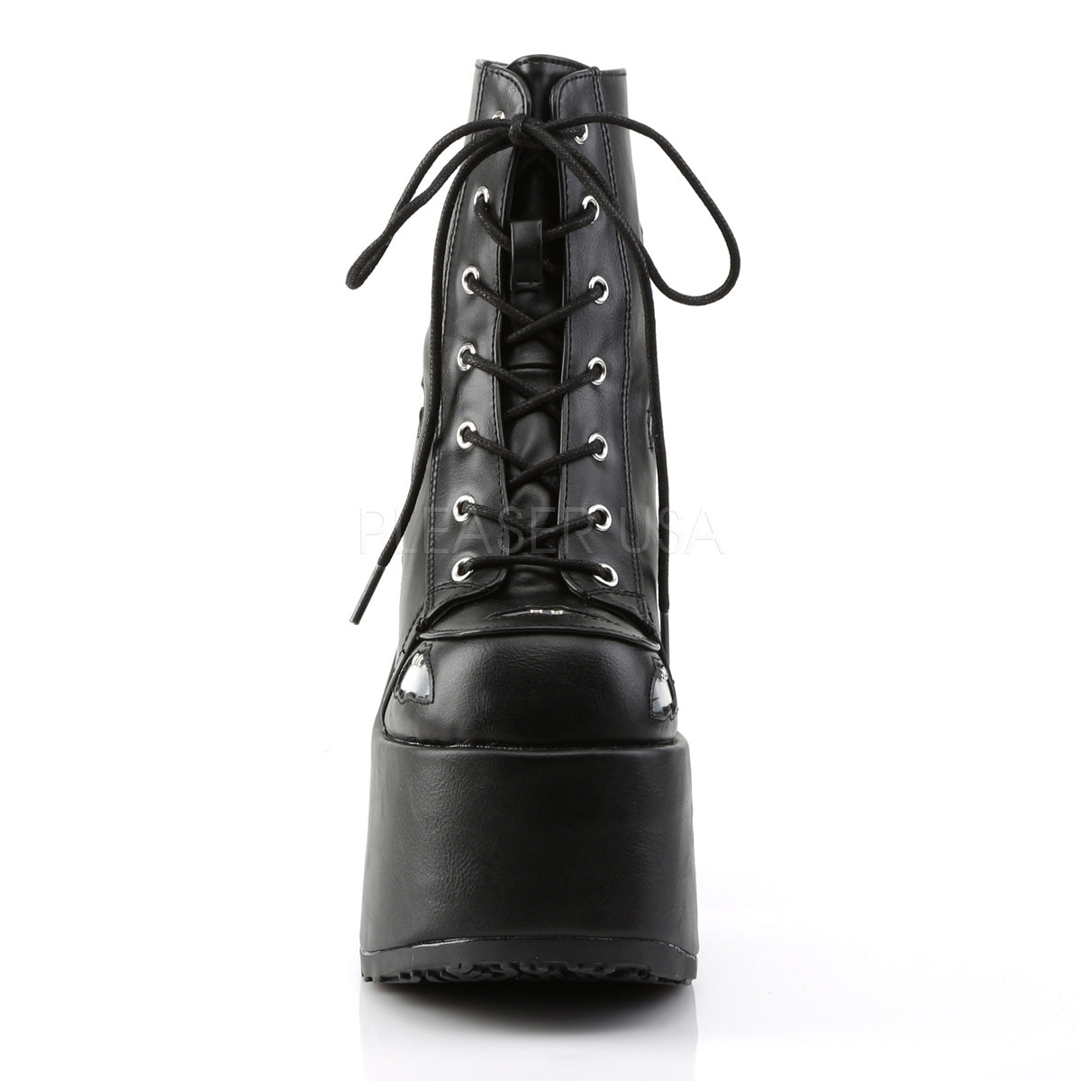 Full Description: 5" Chunky Heel, 3" PF Lace-Up Ankle Boot, Metal Back Zip