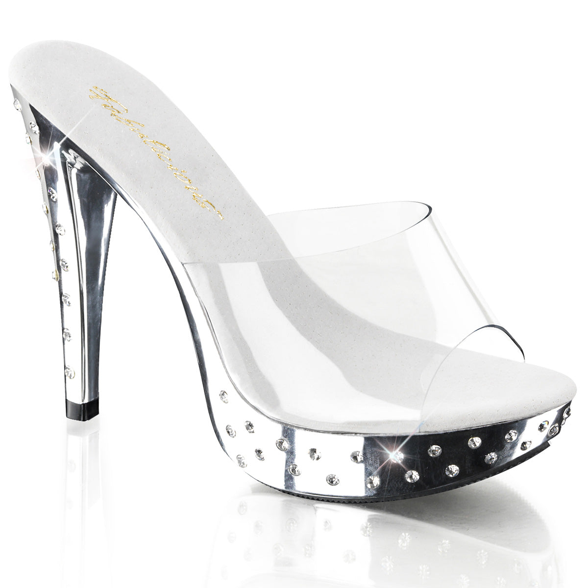 Full Description: *5" Heel, 1" Rhinestone Studded Silver Chrome PF Slide