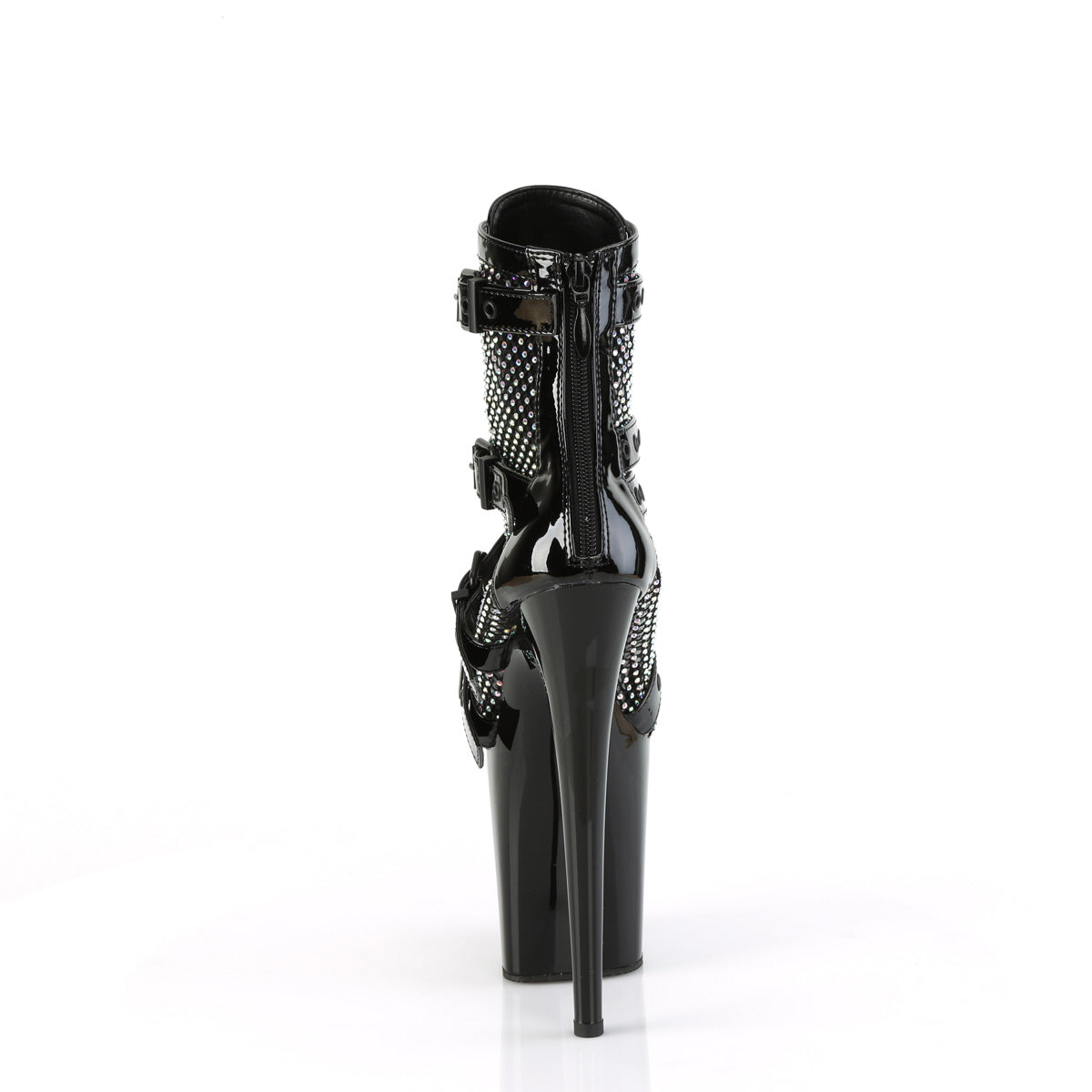 Full Description: 8" Heel, 4" PF Strappy Ankle Boot, Back Zip