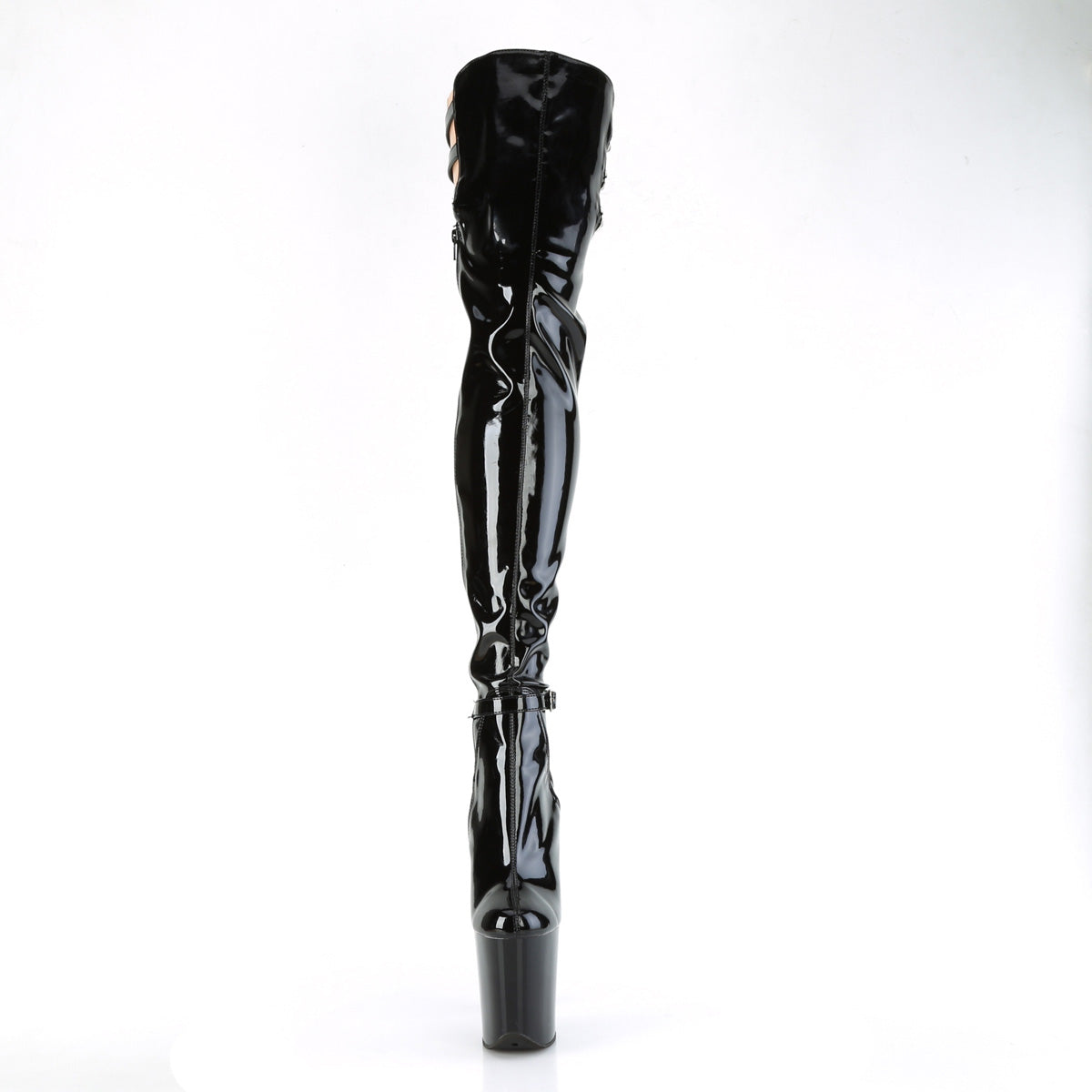 Full Description: 8" Heel, 4" PF Multiple Buckle Thigh Boot, Side Zip