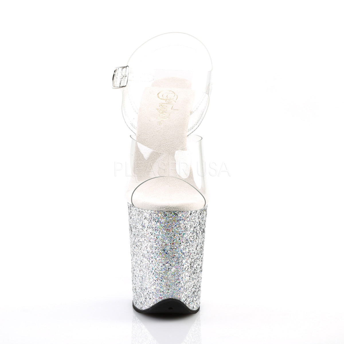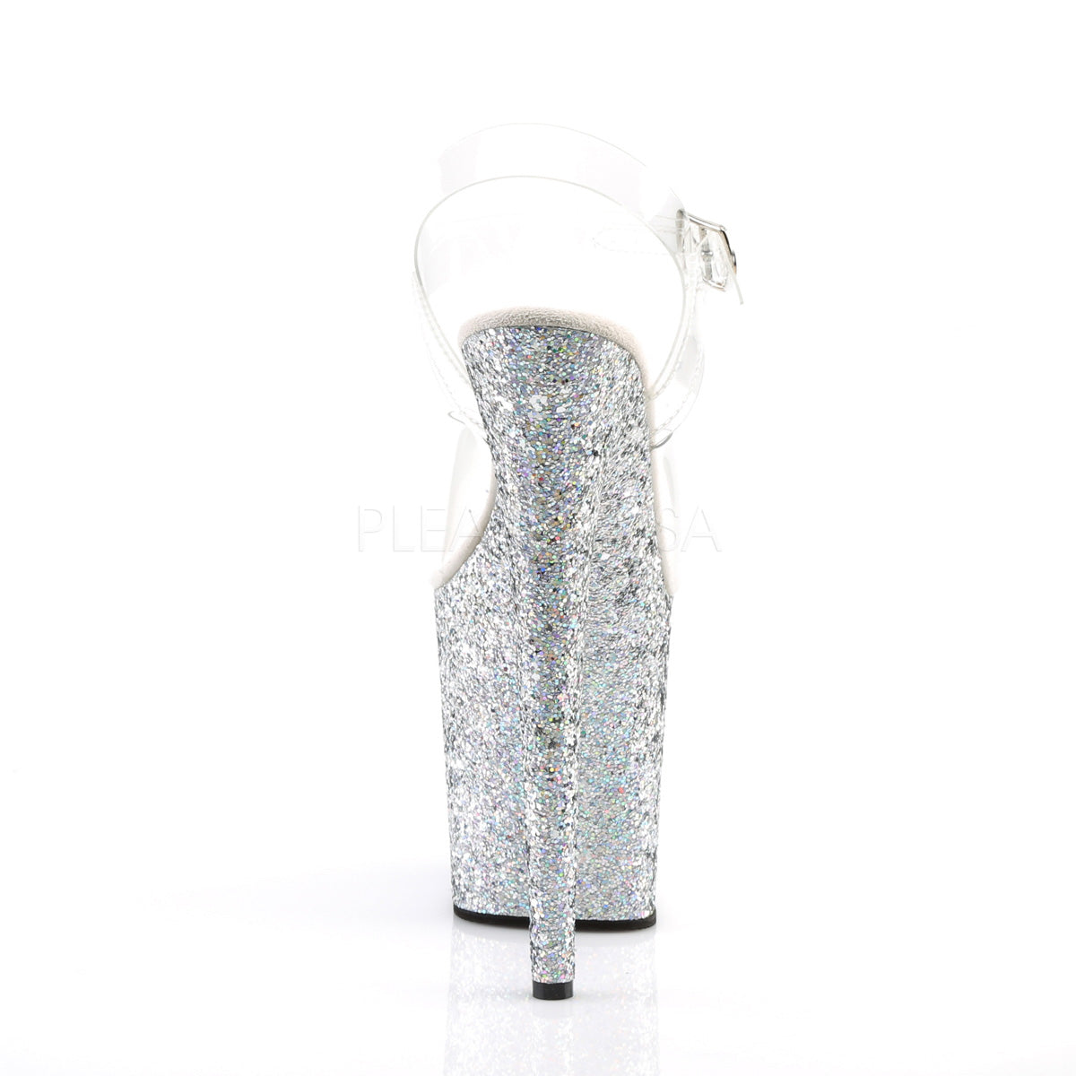 Full Description: 8" Heel, 4" PF Ankle Strap Sandal w/ Glitter Bottom