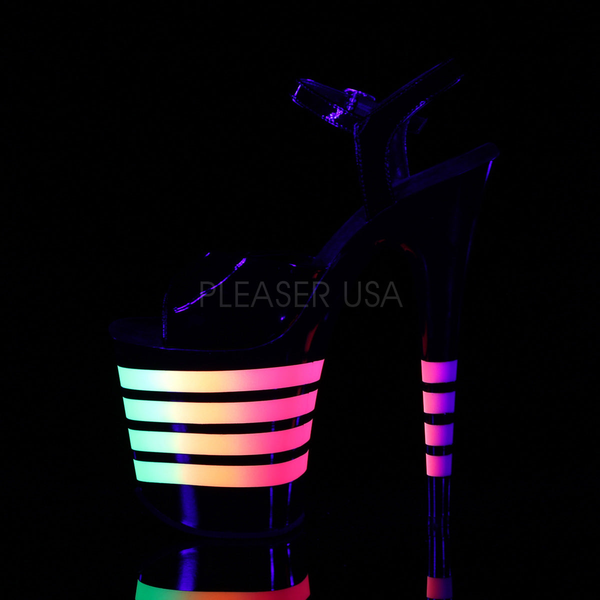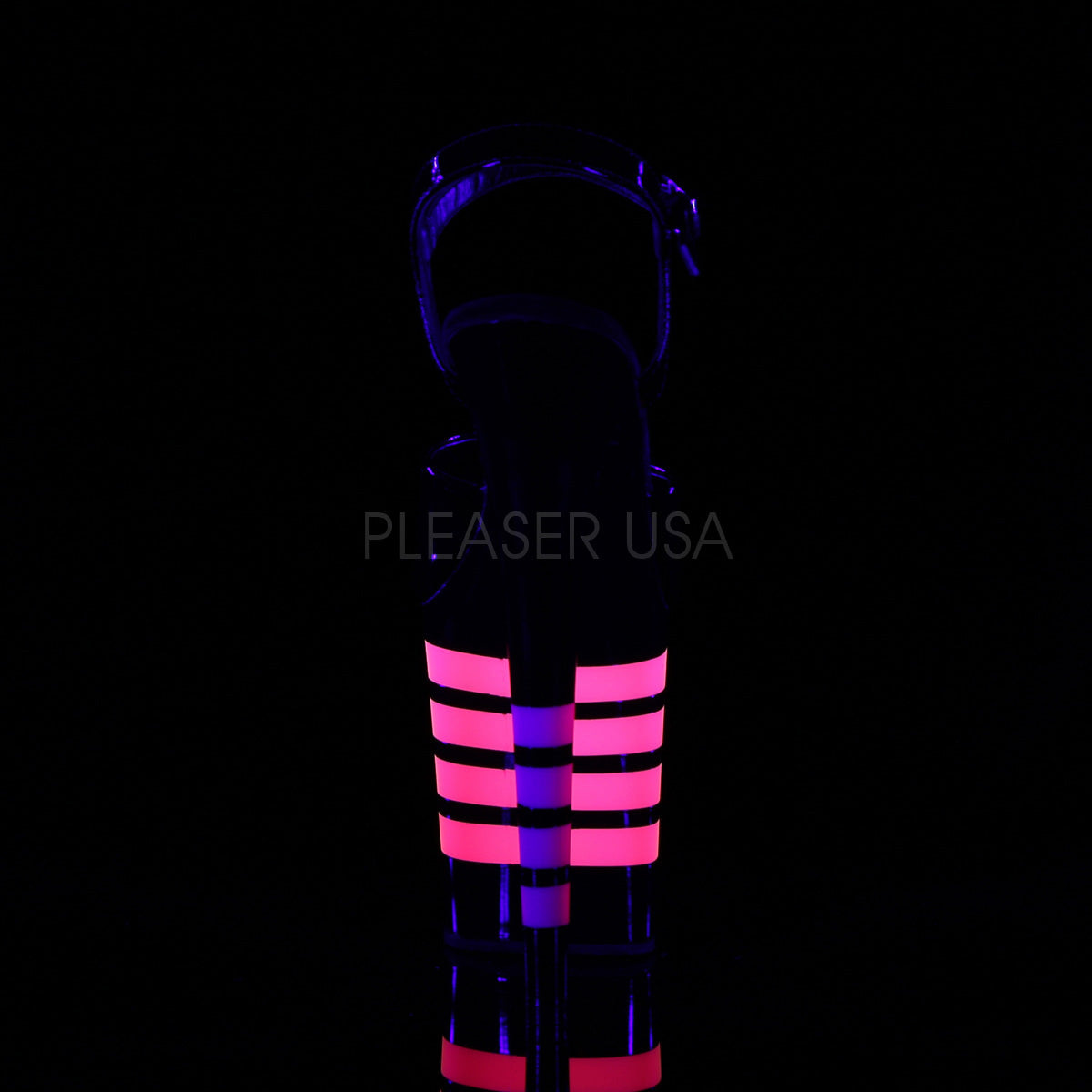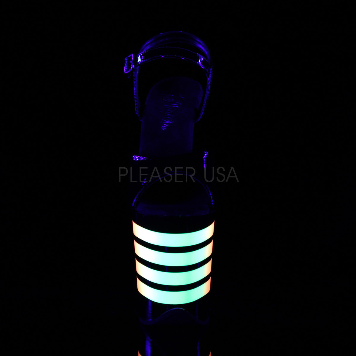 Full Description: *8" Heel, 4" PF Ankle Strap Sandal w/Neon UV Reactive Lines
