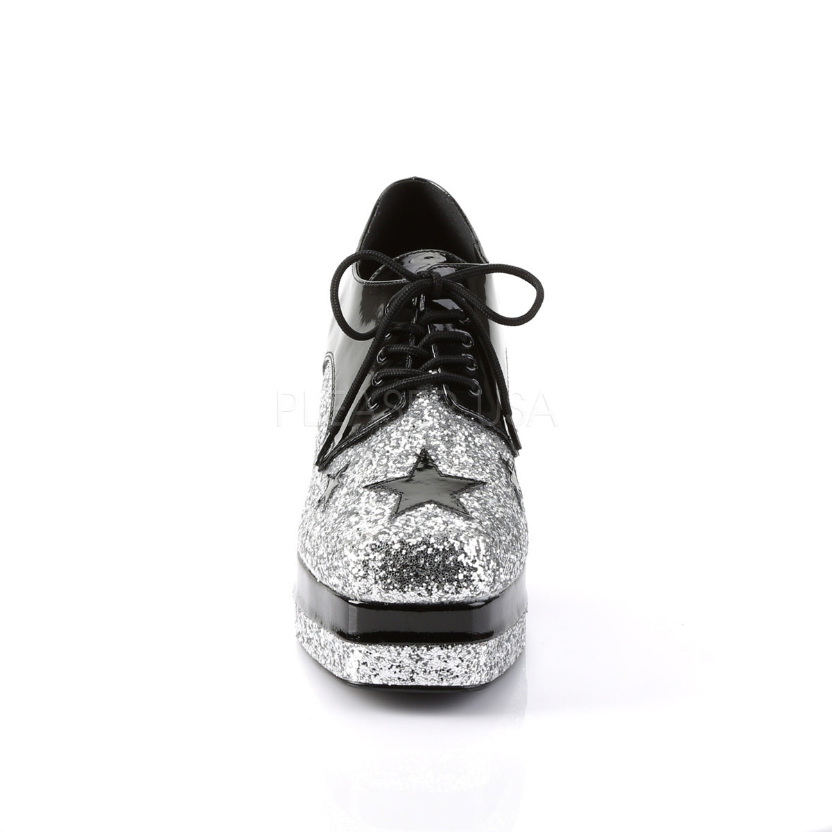 Full Description: 3 1/2" Heel, 1 1/2" Stacked PF, Lace Up Black Glitter Oxford