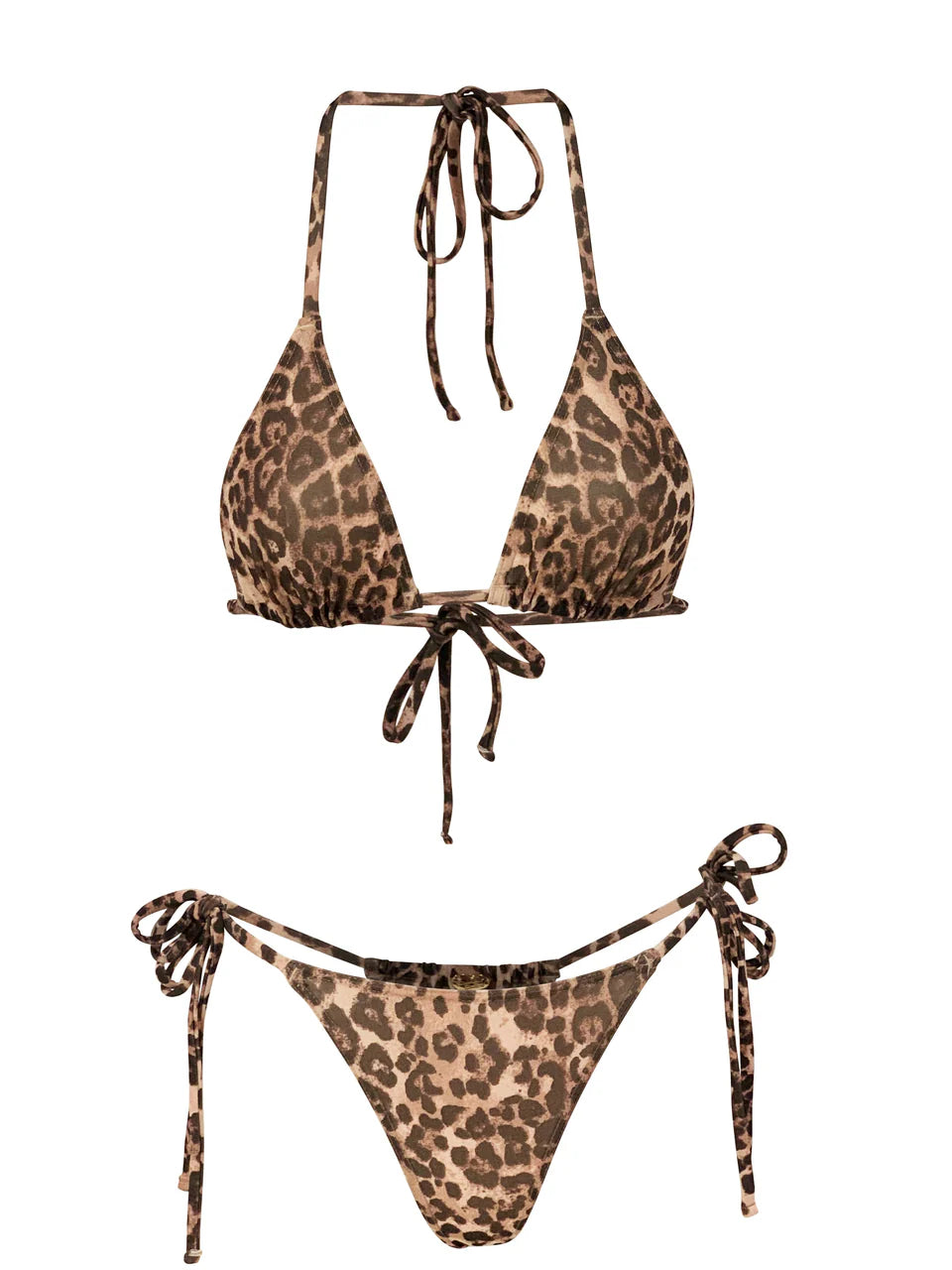Stand out in this playful cheetah bikini featuring a foil spandex slider top, wider front bottoms with a slider back, and a stylish G-string back! What a vibe!