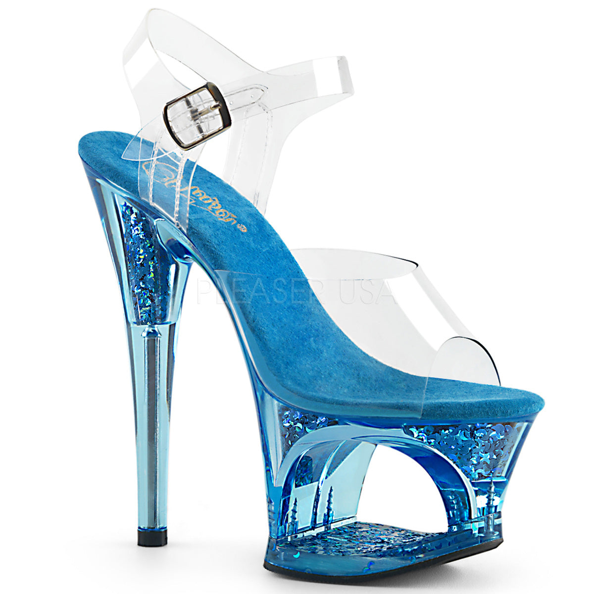 Full Description: *7" Heel,2 3/4"Tinted Cut-Out PF Ankle Strap Sandal w/Gltrs