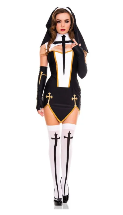 - Item: Music Legs Confess All Your Secrets In This Bad Habit Nun Costume Featuring A Black Dress With A High White Neck, A Cut-out Bust, A Black Cross Accent, A White Front Panel With A Gold Trim, A Tulip Skirt With A Gold Trim, Gold Cross Appliques, A Black And White Habit, Black Fingerless Gloves With Gold Cross Detailing, And White Thigh High Stockings With Black Cross Detailing. ML70259