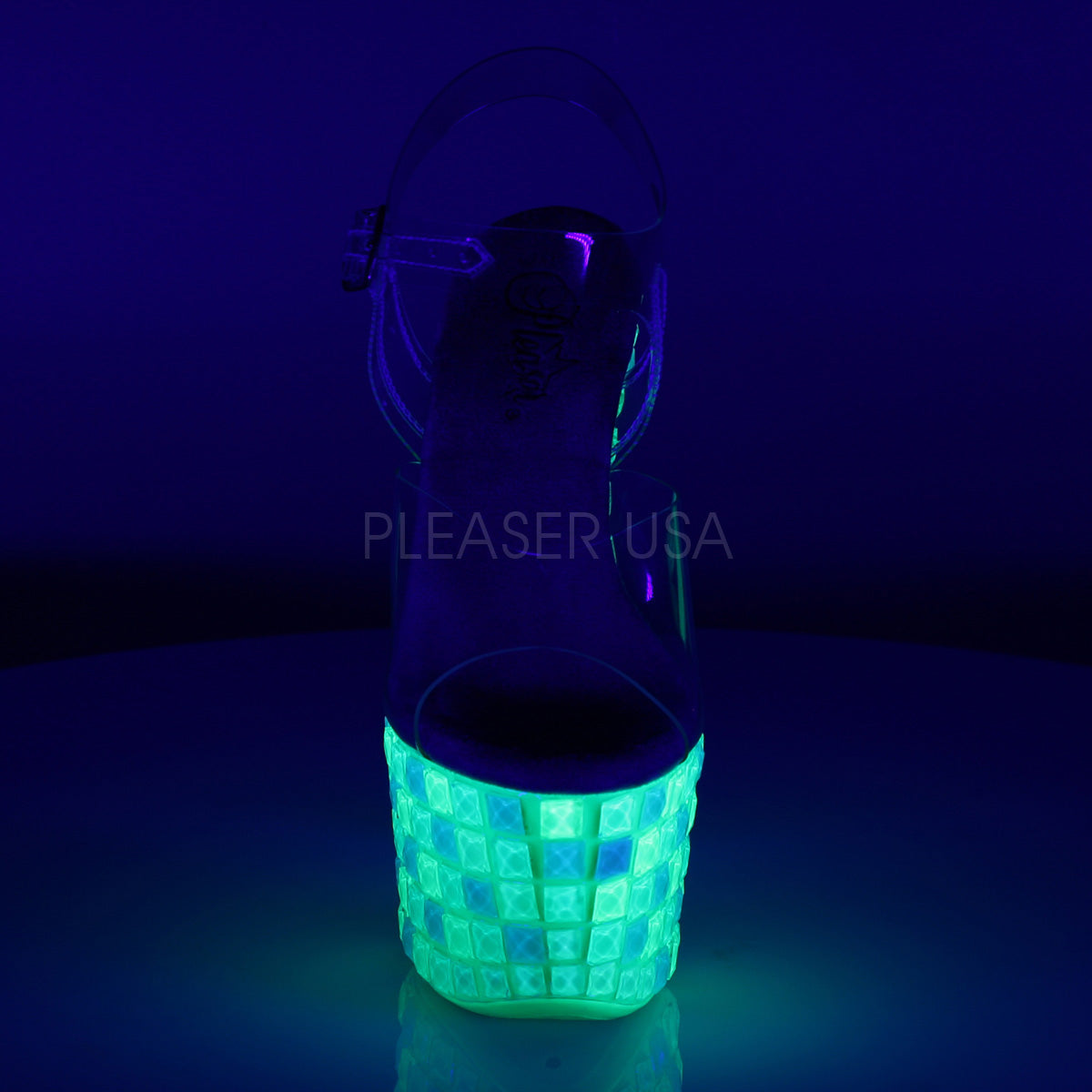 Full Description: *7" Heel, 2 3/4" PF Ankle Strap Sandal, Blacklight Reactive
