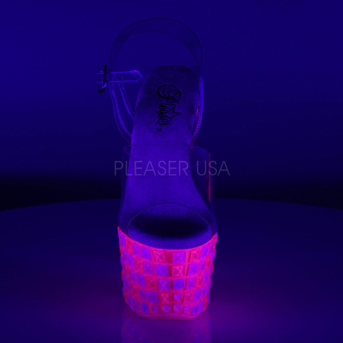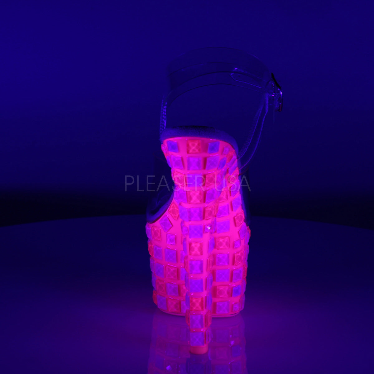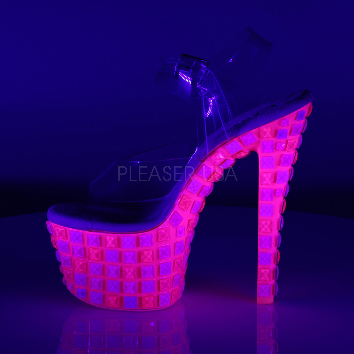 Full Description: *7" Heel, 2 3/4" PF Ankle Strap Sandal, Blacklight Reactive