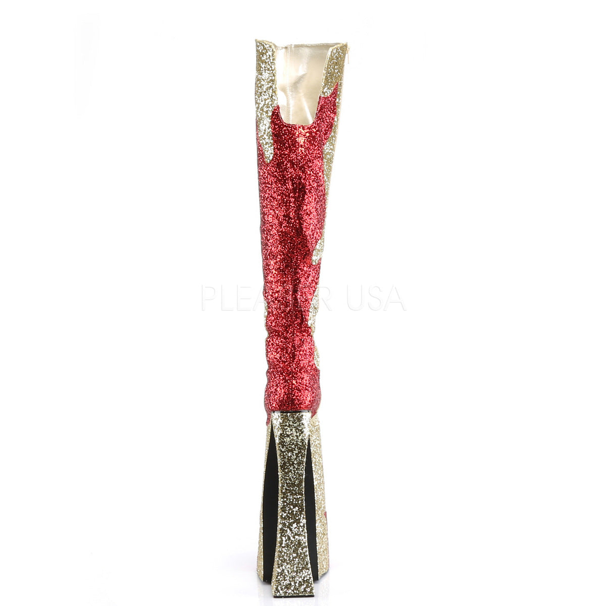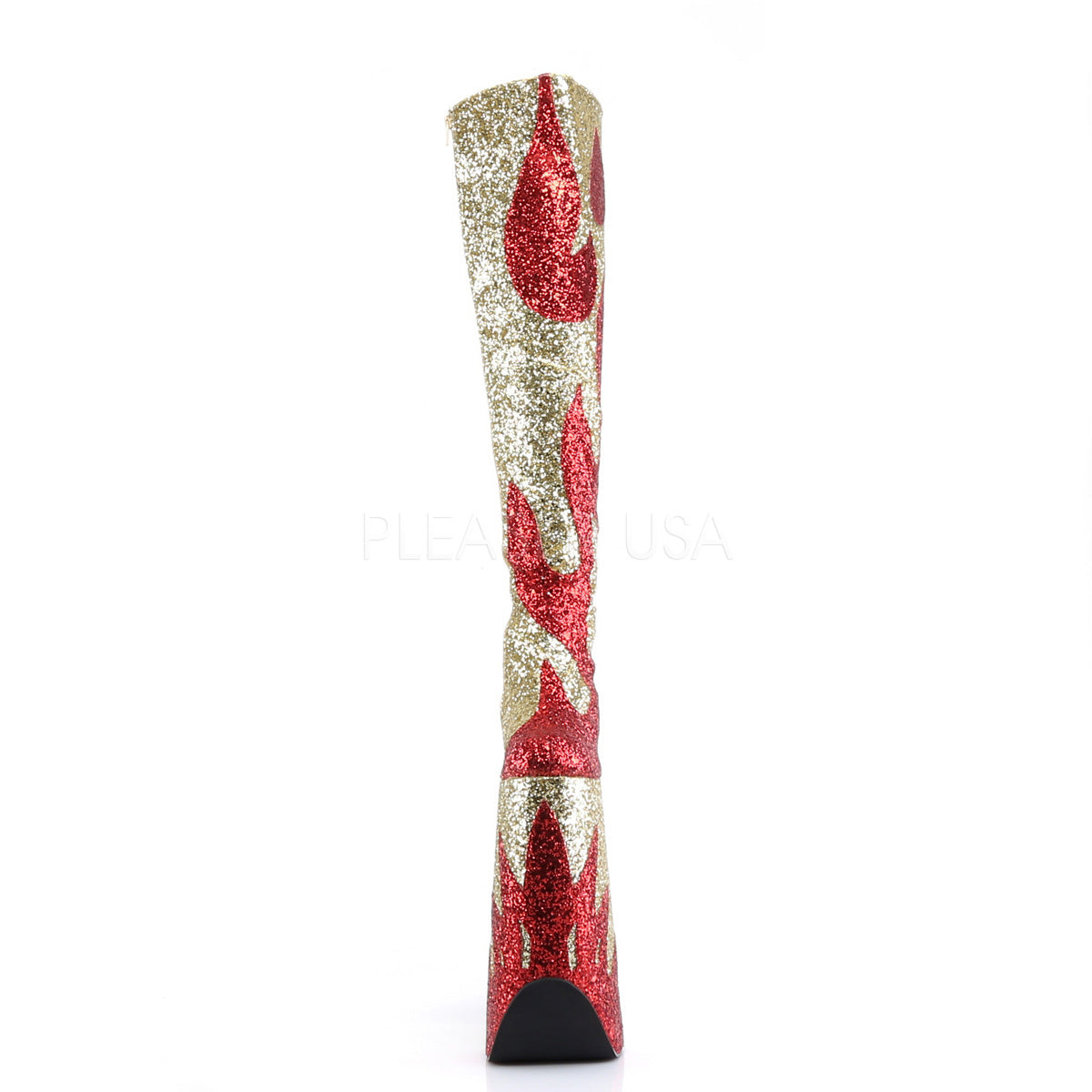 Full Description: **11" Heel, 9 3/4" PF Thigh Boot, Flame Glitt Pattern
