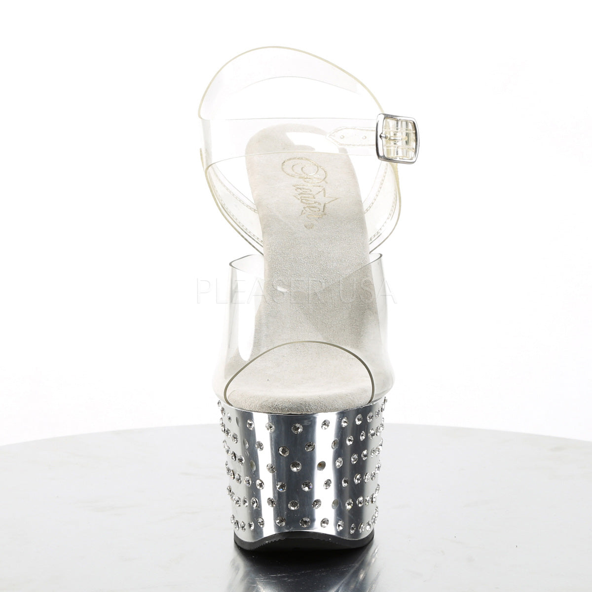 Full Description: 7" Heel, 2 3/4" R/S Studded Slv Chrome PF Ankle Strap Sandal