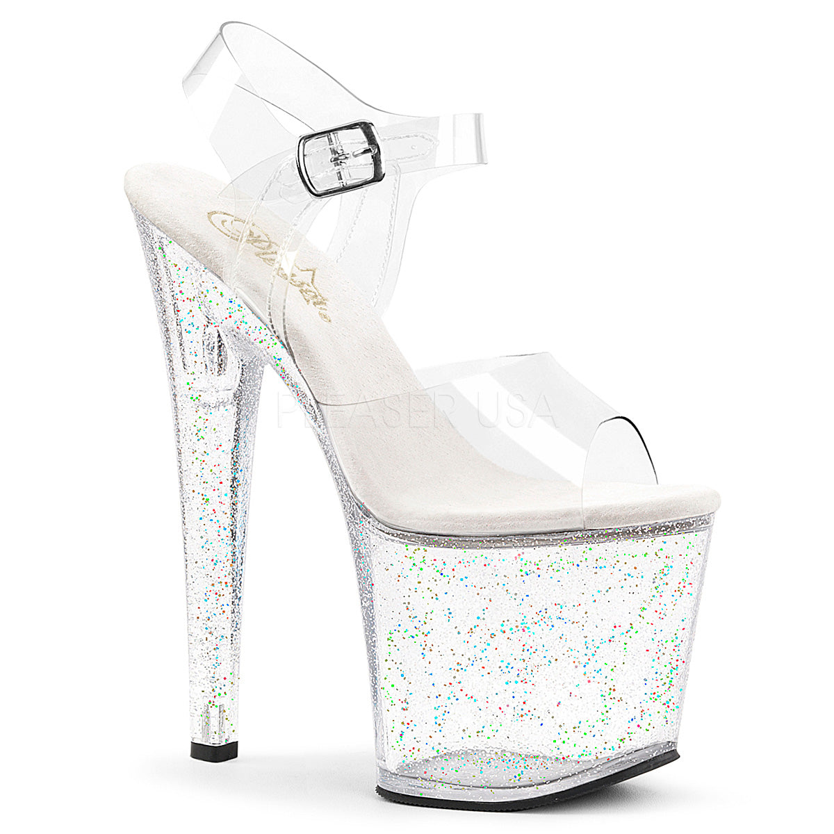 Full Description: 7 1/2" Heel, 3 1/2" PF Ankle Strap Sandal w/Glitter