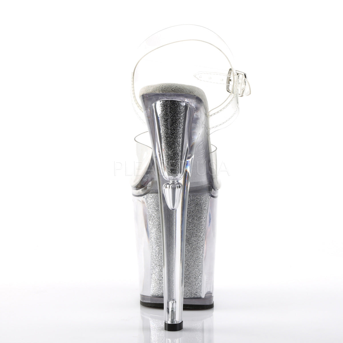 Full Description: 8" Heel, 4" PF Ankle Strap Glitter-Filled PF Sandal
